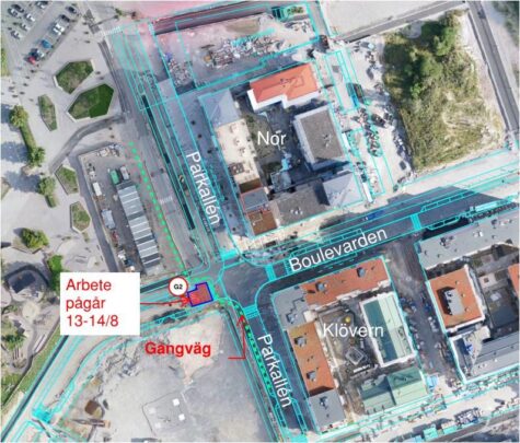 Den 13 augusti påbörjas färdigställandet av korsningen Parkallén och Boulevarden. Arbetet kommer att utföras i etapper och pågår i ca två veckor med start den 13 augusti. På bilden framgår var första etappen påbörjas.